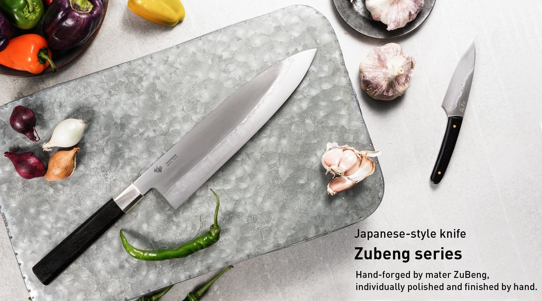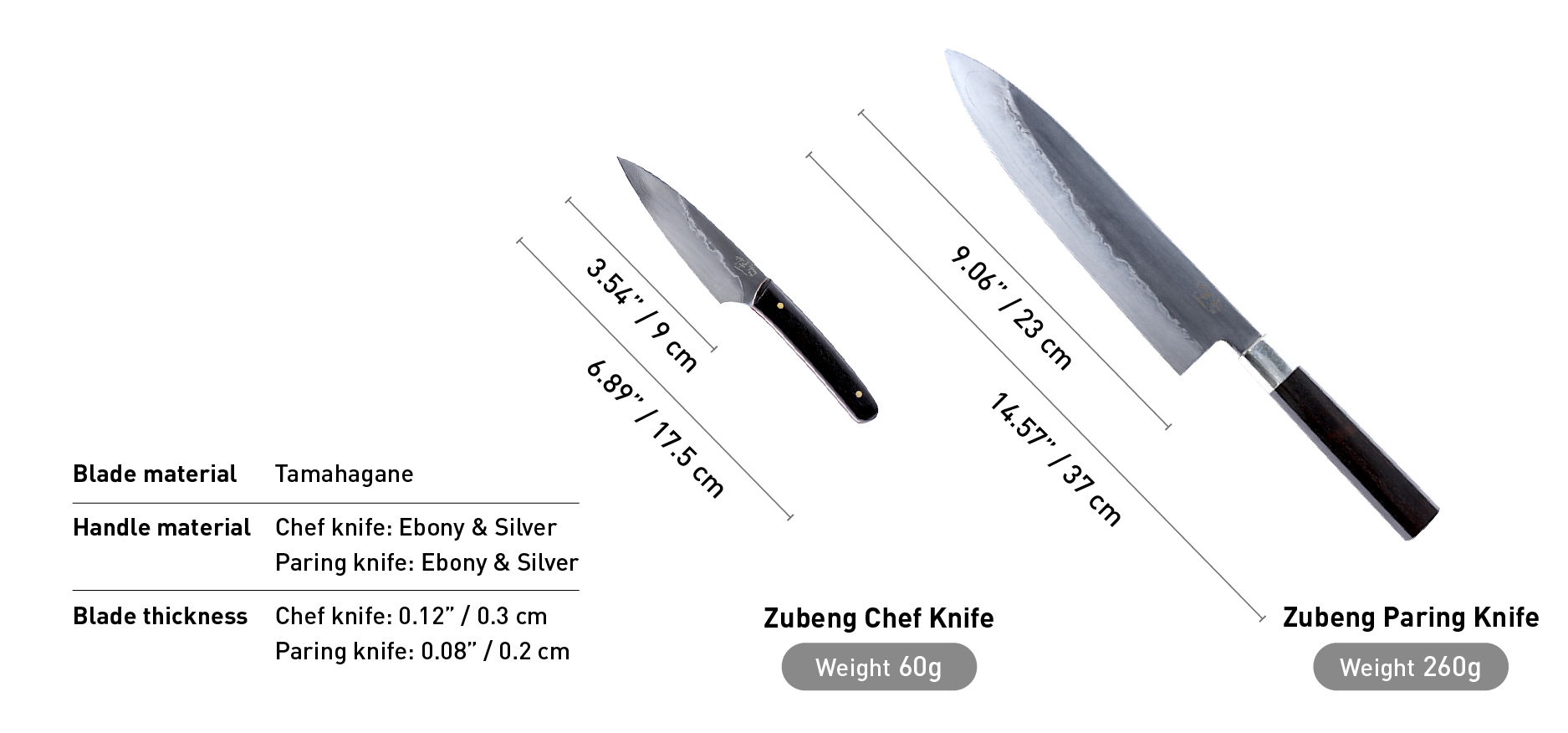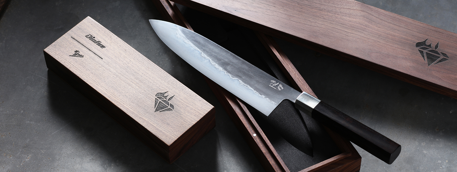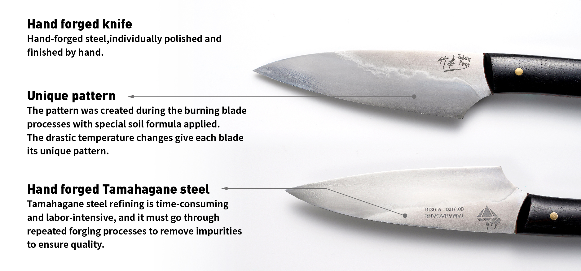 Zubeng chef's knife is a forged knife using Tamahagane steel to make hard blade and have sharp fine tip. The material is made traditionally by heating it up to about 1800 degrees Fahrenheit in a Tatara clay furnace. Zubeng chef's knife is utilized technical process, classical in construction by a blade smith-Zubeng Chen. Each knife has its own pattern that makes each knife unique. The handle material is ebony makes comfortable usage. Diafire and Zubeng co-present each knife gift-boxed in the walnut wood box package for our customers. We hope you enjoy using for many years to come under your careful maintenance.